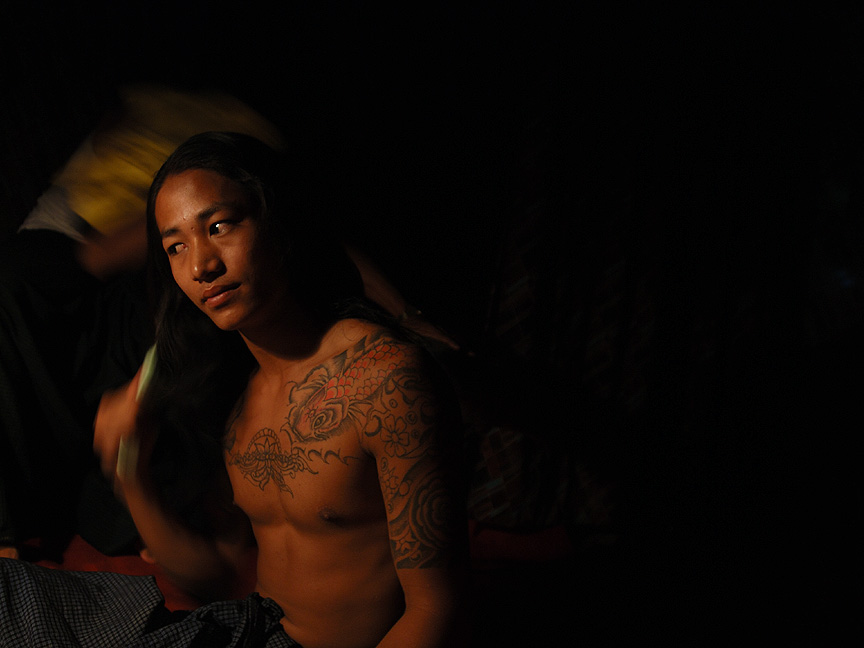 [ A performer preparing for the traditional stage(zat pwe). ]