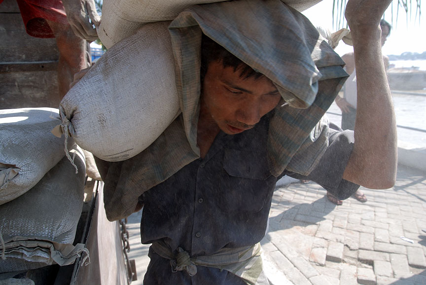 [ Unloading the heavy bags from the truck, then loading them upto the ship. ]