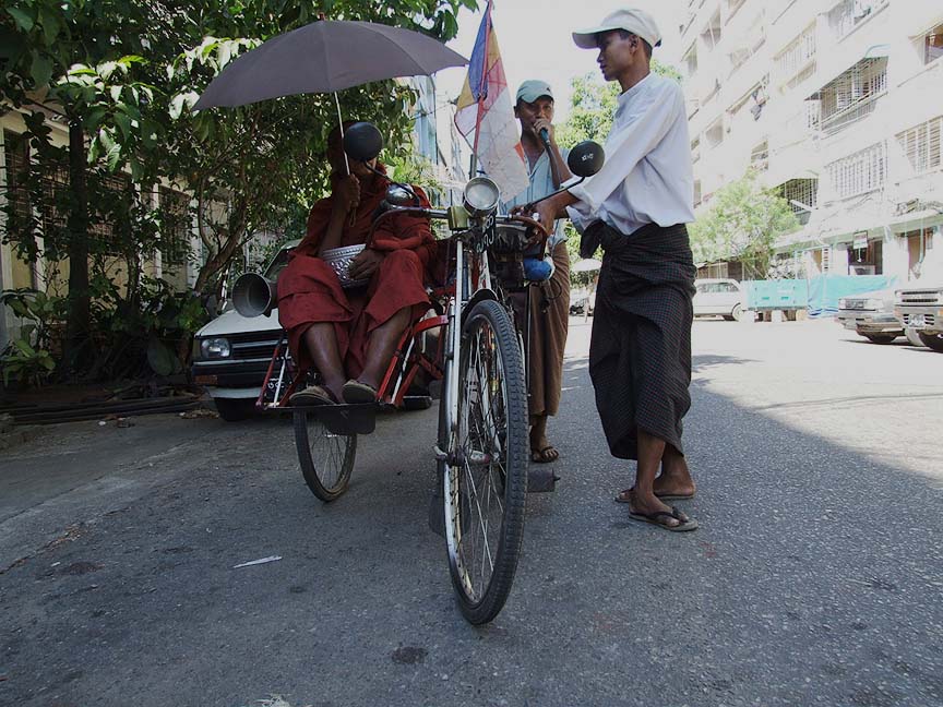 [ A sayadaw(pongyi) sit on the trishaw going around for alms with followers. ]